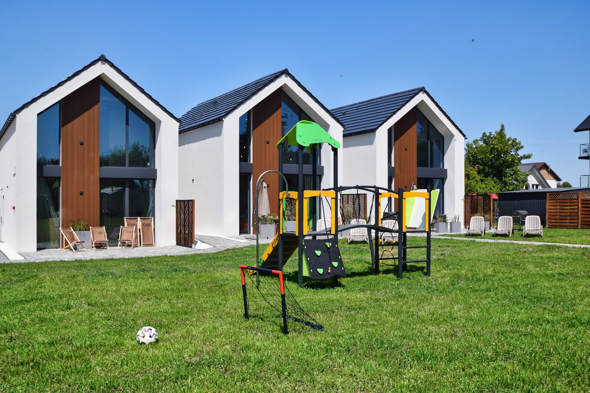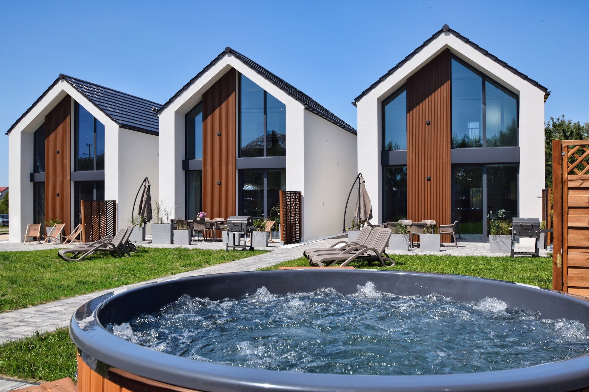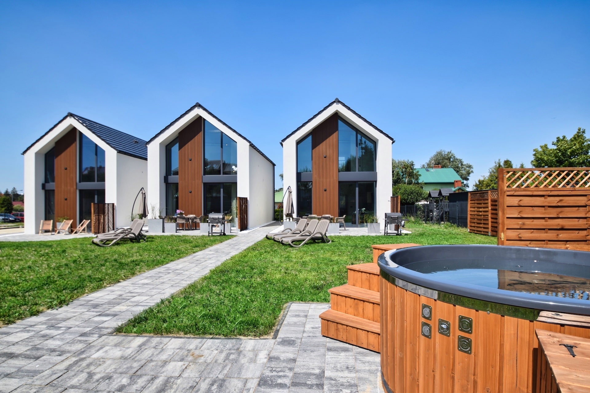Każdy domek to ok. 80 m2 i składa się z: trzech dwuosobowych sypialni, dwóch łazienek oraz salonu z aneksem i antresolą. Jest to przestrzeń, która pomieści maksymalnie 8 osób pragnących boskiego wypoczynku.