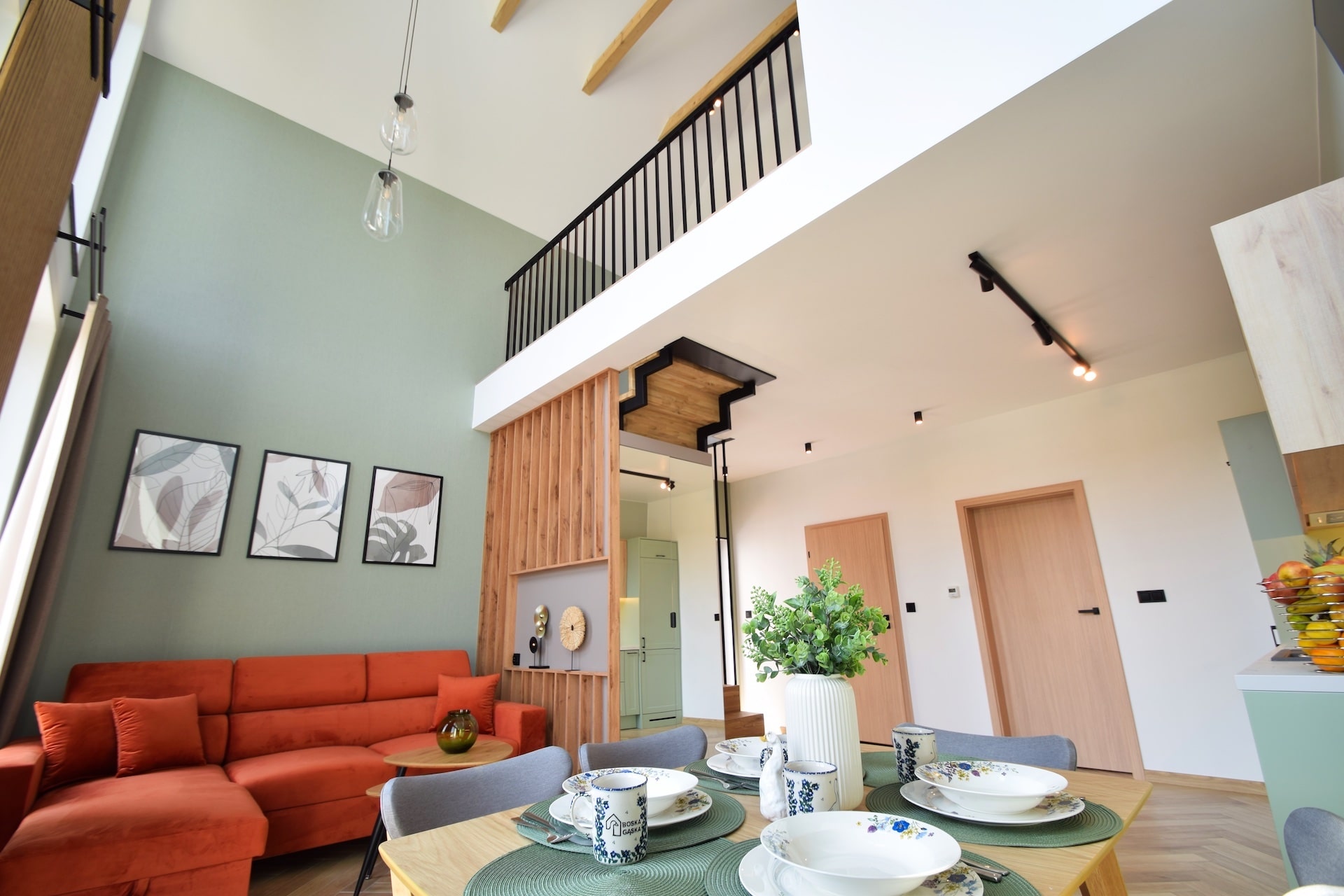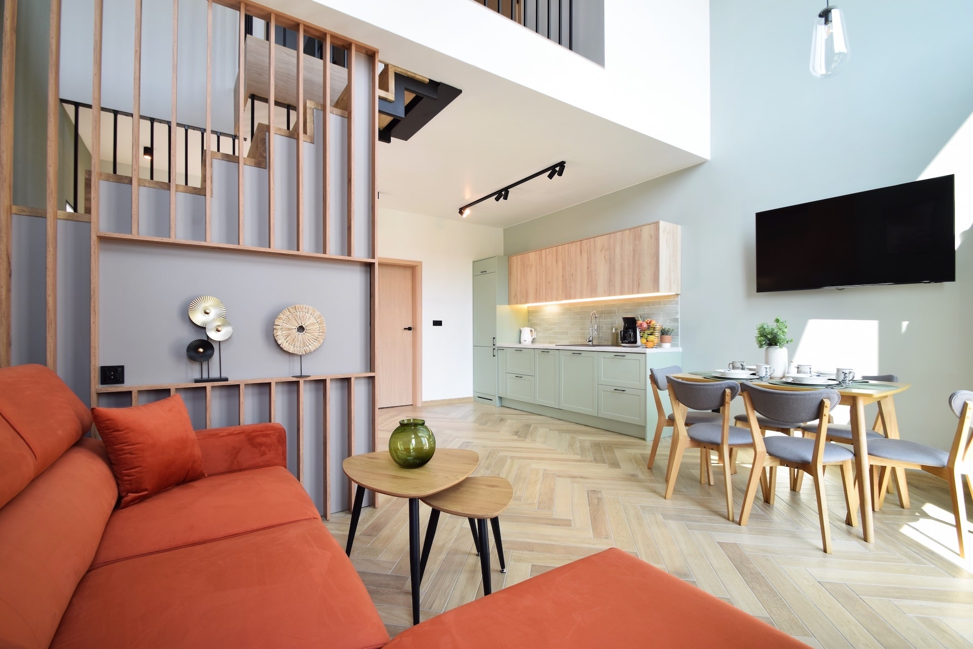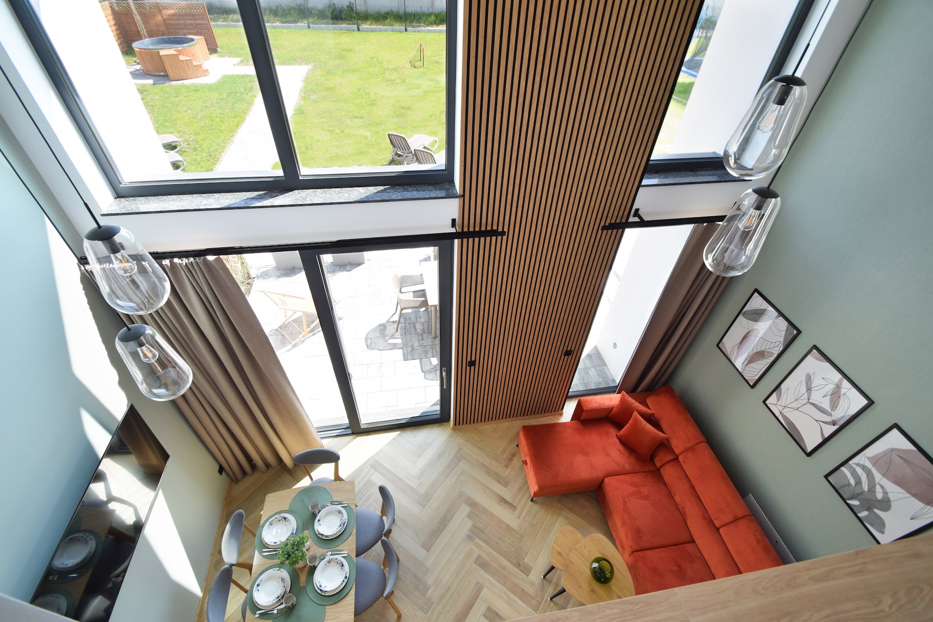 Każdy domek to ok. 80 m2 i składa się z: trzech dwuosobowych sypialni, dwóch łazienek oraz salonu z aneksem i antresolą. Jest to przestrzeń, która pomieści maksymalnie 8 osób pragnących boskiego wypoczynku.